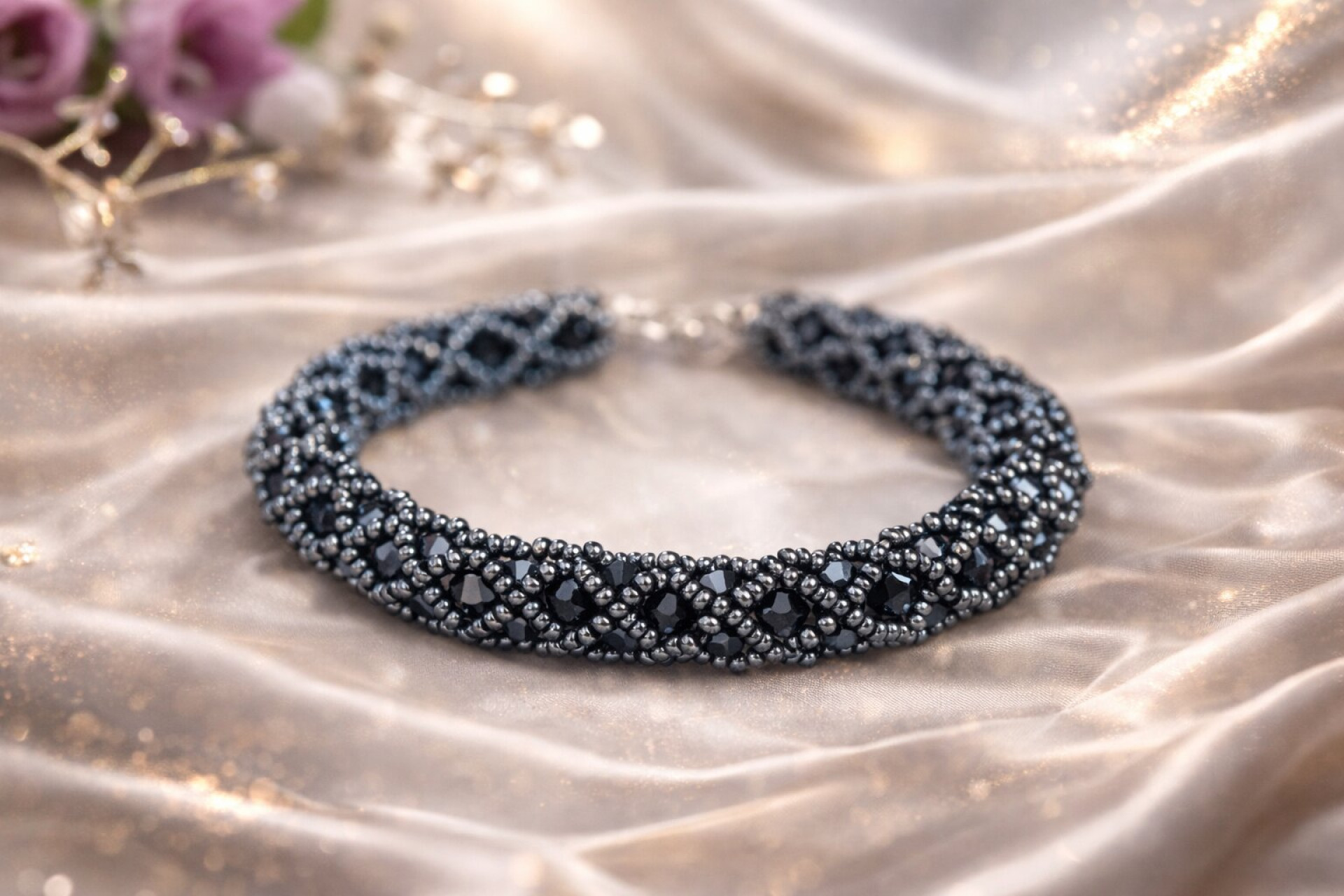 Elegantný a neprehliadnutelný náramok je vytvorený technikou ""potrubná pošta"". Použila som sklenené koráliky s AB efektom a korálky Preciosa.